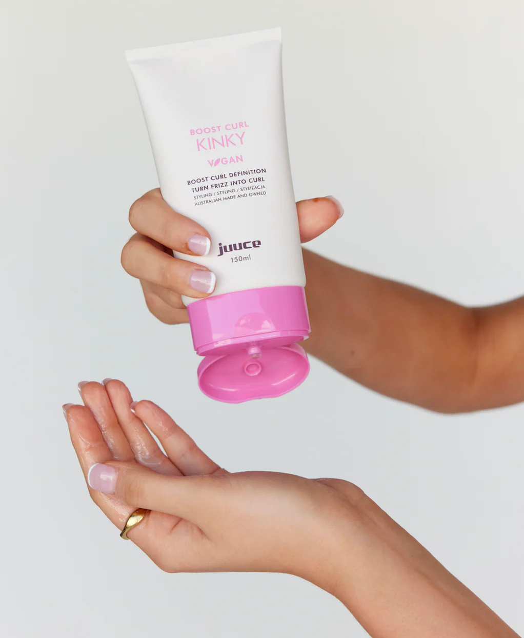 品牌:juuce 名稱:Boost Curl Kinky 容量:150ml 產地:澳洲 特點: 終極的捲曲定型,控制和造型的乳霜,將鬆散頭髮變成美麗鬈髮。 * 可用於濕髮或乾髮之上 * 抗熱力+抗紫外線+抗濕度+抗氧化保護 * 定型、減少毛躁、曲髮豐盈 用法: 完成洗髮後,在半乾濕狀態下將產品塗抹於頭髮中間和髮尾,然後吹乾及造型。